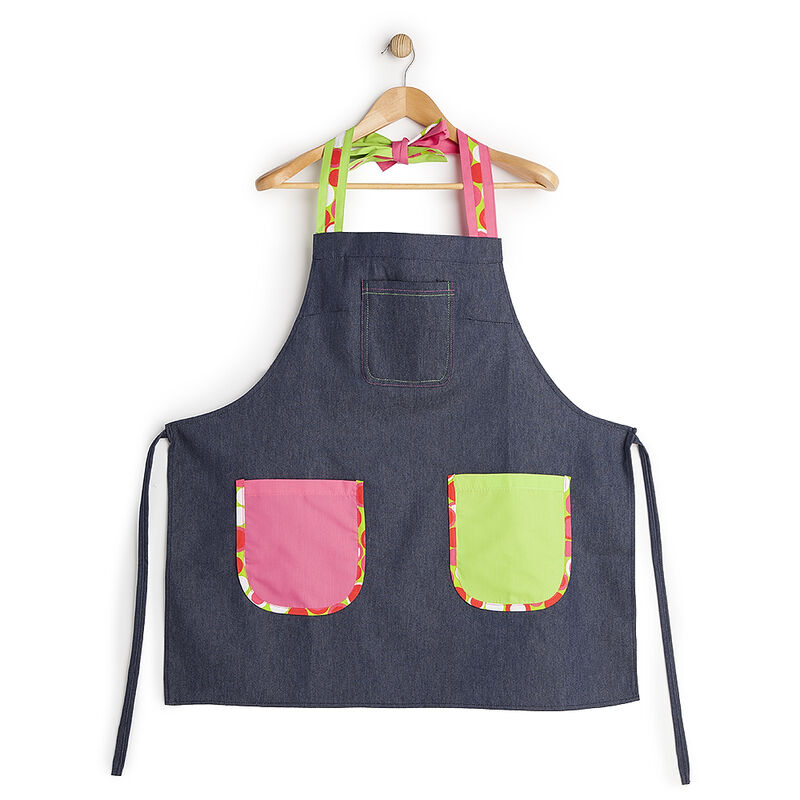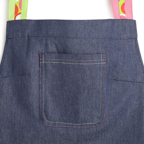 Delantal con peto tejano combinada con tres bolsillos.Talla única.Medidas: 72 x 72 cm., aproximadamente. Pueden variar unos centímetros